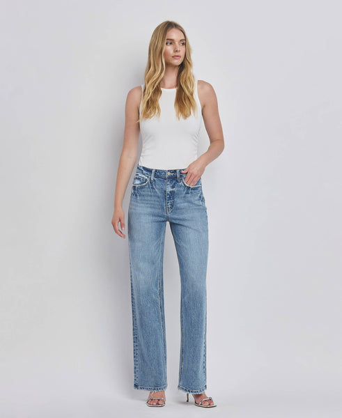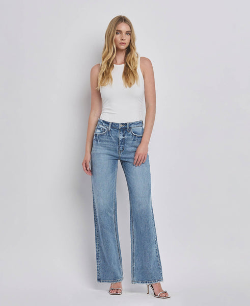 90's super high rise, wide jeans. Comfort stretch. Lightly distressed detail.