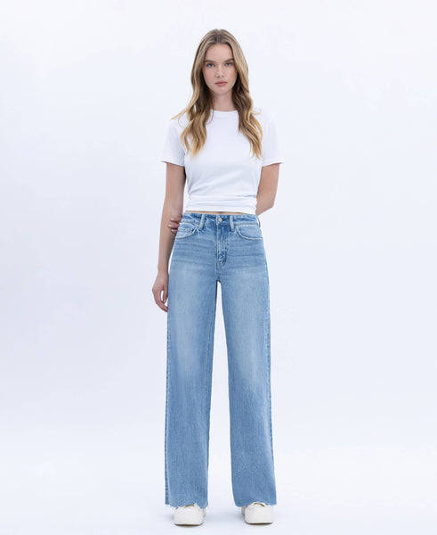 High rise. clean cut raw hem. wide leg. comfort stretch denim.