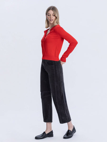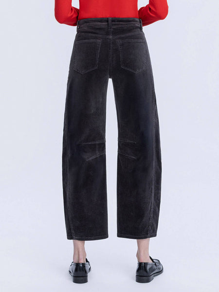 High rise. Comfort stretch. Dark gray corduroy barrel jean.