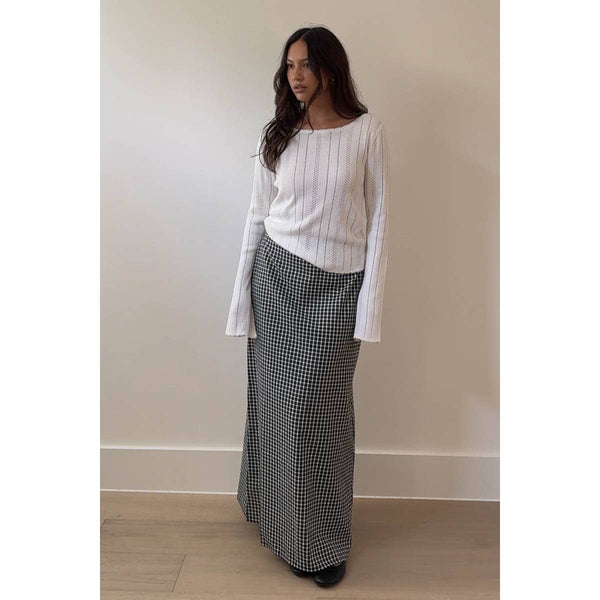 This lightweight pointelle knit top features a classic boat neck and long flared sleeves. The slim-fit silhouette adds a delicate, feminine touch to any outfit, while the intricate pointelle texture enhances its airy look, making it perfect for layering or wearing on its own.