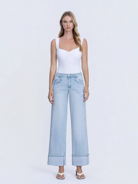 Super high rise. Light wash. Cuffed baggy wide jeans. Comfort stretch.
