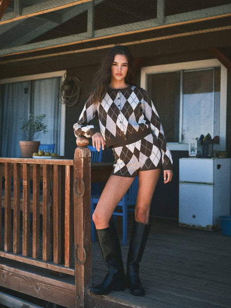 This cozy knit cardigan features a signature argyle print, semi-cropped length, and long sleeves for effortless layering. The front button closure offers versatility for styling.
